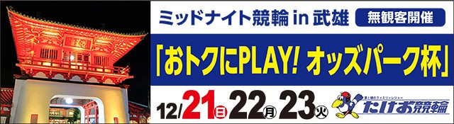 武雄競輪のミッドナイト「おトクにPLAYオッズパーク杯」が21日~23日の日程で行われる。今節はA級1、2班戦とガールズケイリンの二本立て。