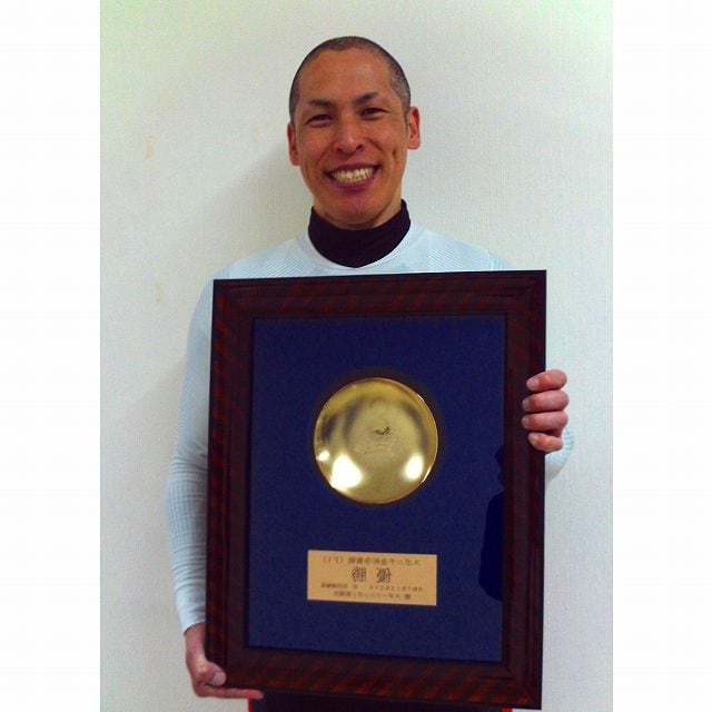 スポニチ金杯の盾を手に笑顔を見せる河端朋之