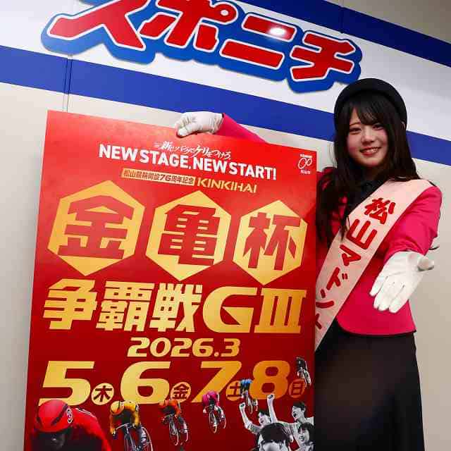 松山競輪のPR隊が2月24日、大阪市北区のスポニチ編集局に。バンク改修工事を終え、リニューアル後の記念レースに吉田拓矢、寺崎浩平、南修二のSS3選手に加え、地元愛媛の松本貴治や犬伏湧也など四国地区も強力メンバーが参戦する。