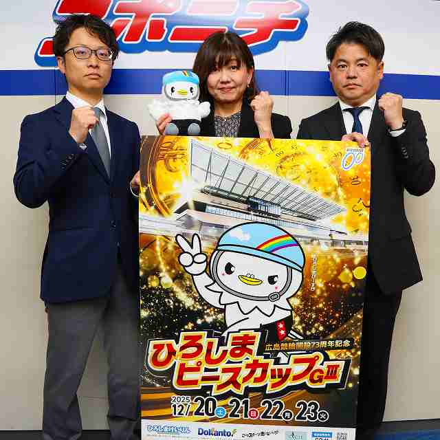 広島市経済観光局競輪事務局の松本亜紀事務局長がPR隊とともに12月12日、大阪市北区のスポニチ編集局を訪れた=写真。リニューアル後、初開催となる記念は2年連続5度目のVを目指す松浦悠士が中心だ。同じ中四国地区の犬伏湧也らとともに地元エースの意地を見せる。